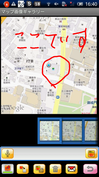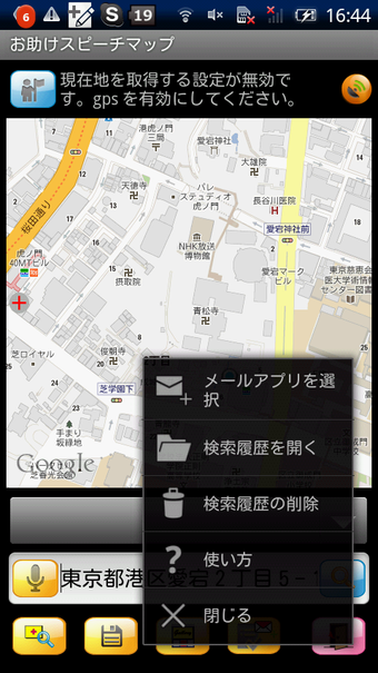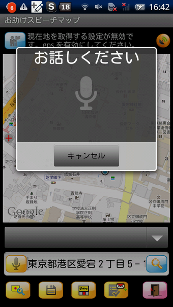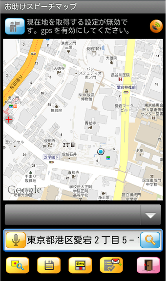 お助けスピーチマップは、GPSかWi-Fiでの位置検索を設定後、起動すると即座に現在位置が地図(Google maps)で表示されます。画面下のテキストボックスには現在位置の住所が表示される他、マイクのアイコンをタップすると音声でメッセージ入力しができ、地図と一緒にメール送信することができます。目的地まであと少しで迷ってしまったなどというときには、このアプリからさっと助けを求めれば、きっとすぐにあなたの居場所に気づいてくれるでしょう。